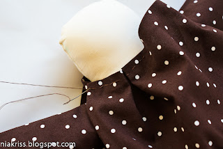 горловина платья сильно велика, а нам надо пришить ее к тушке. это и будет нашим основным креплением. тут я тоже закладываю складочки и пришиваю вручную.